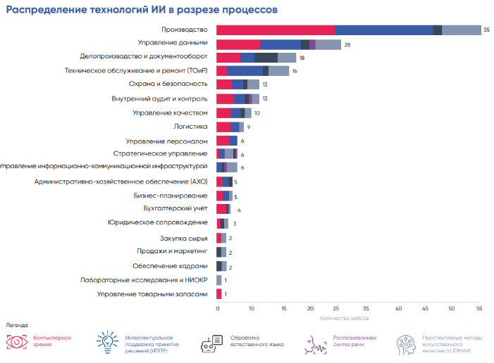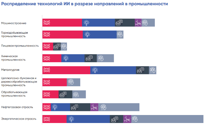 Наибольшее применение в промышленности в настоящее время находят компьютерное зрение и ИППР. При этом распределение различных типов ИИ-систем неравномерное: если компьютерное зрение и перспективные методы искусственного интеллекта (ПМИИ) применяются практически во всех ее отраслях, то кейсы применения технологий распознавания и синтеза речи встречаются пока лишь в машиностроении, нефтегазовой и энергетической отраслях.