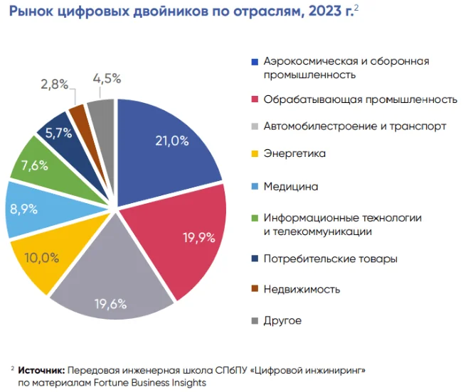 Цифровой двойник изделия – система, состоящая из цифровой модели изделия и двусторонних информационных связей с изделием и/или его составными частями. Применение таких технологий помогает обеспечивает непрерывную оптимизацию и совершенствование процессов и изделий (систем), что позволяет сократить сроки на производство изделия, оптимизировать расход ресурсов на его производство, продлить эксплуатацию изделия и т.д. Активнее всего рост применения этой технологии идет, по понятным причинам, в аэрокосмической и оборонной промышленности (21%), а также в обрабатывающей промышленности (19,9%).