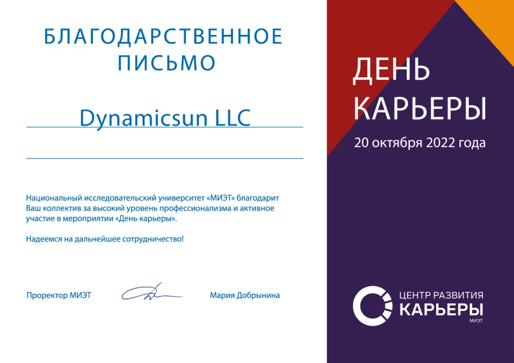 20 октября 2022 года состоялся ежегодный День карьеры в МИЭТе. В университете прошла выставка работодателей, в которой команда Dynamicsun приняла участие.