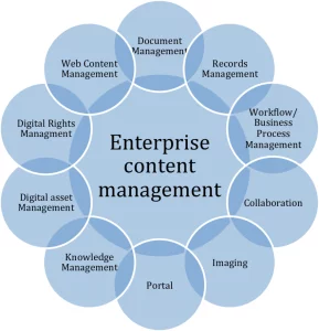 Управление информацией производится непрерывно на всём этапе ЖЦ (жизненного цикла). Жизненный цикл начинается с момента принятия решения о необходимости создания того или иного документа и заканчивается в момент его изъятия из эксплуатации. Информация плотно входит во все бизнес-процессы в компании, она создаётся и обрабатывается постоянно при помощи специальных компьютерных программ. Общий подход к управлению процессами компании, возможен с подключением всей организации к ЕСМ системе.