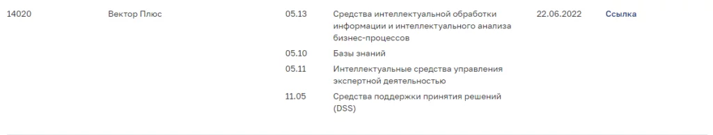 22 июня 2022 года платформа «Вектор Плюс» была занесена в единый реестр отечественного программного обеспечения от Минцифры (присвоен номер 14020). Основной класс ПО определен как «Средства интеллектуальной обработки информации и интеллектуального анализа бизнес-процессов». Занесение в реестр подтверждает соответствие стандартам программы цифрового импортозамещения.